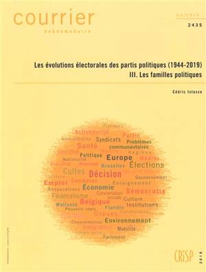 Ce Courrier hebdomadaire se penche sur un aspect particulier de l’histoire des familles politiques : leurs évolutions électorales depuis la fin de la Seconde Guerre mondiale. Le constat qui s’impose est celui d’un déclin global, d’abord somme toute limité jusqu’au début du 21e siècle mais qui s’amplifie et s’accélère depuis une dizaine d’années. En 1958, le score électoral cumulé des familles culminait à 95 %. En 2019, il est d’à peine 57 %. Bien plus, si l’on ne s’intéresse qu’aux trois familles dites traditionnelles (rouge, bleue et orange), le chiffre chute désormais – ce qui constitue un fait sans précédent – sous la barre des 50 %. Cette évolution est particulièrement marquée pour les socialistes en Wallonie, pour les libéraux en Région bruxelloise et pour les sociaux-chrétiens en Flandre. Pour leur part, les écologistes ont connu un mouvement « en dents de scie ».