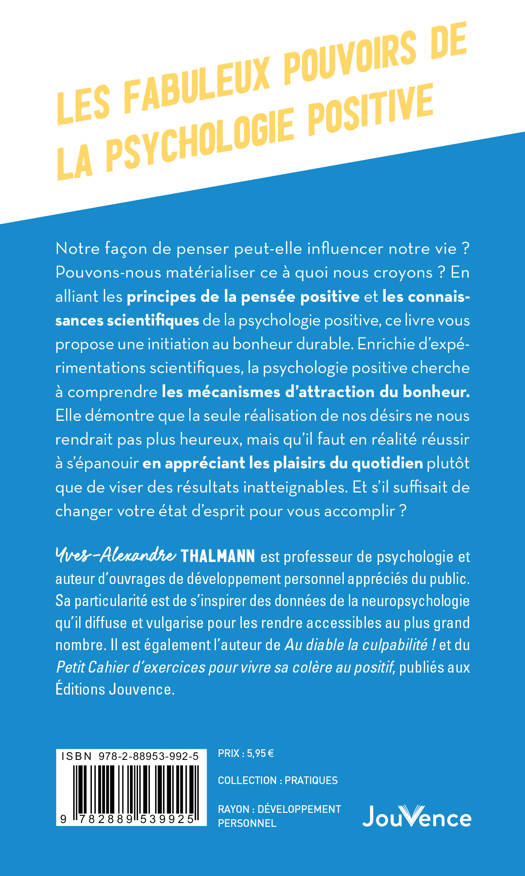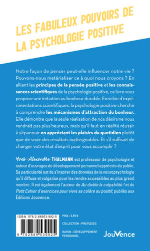 Notre façon de penser peut-elle influencer notre vie ? Pouvons-nous matérialiser ce à quoi nous croyons ? En alliant les principes de la pensée positive et les connaissances scientifiques de la psychologie positive, ce livre vous propose une initiation au bonheur durable. Enrichie d’expérimentations scientifiques, la psychologie positive cherche à comprendre les mécanismes d’attraction du bonheur. Elle démontre que la seule réalisation de nos désirs ne nous rendrait pas plus heureux, mais qu’il faut en réalité réussir à s’épanouir en appréciant les plaisirs du quotidien plutôt que de viser des résultats inatteignables. Et s’il suffisait de changer votre état d’esprit pour vous accomplir ?