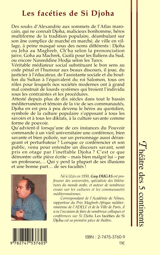Des souks d'Alexandrie aux sommets de l'Atlas marocain, qui ne connaît Djoha, malicieux bonhomme, héros multiforme de la tradition populaire. Véritable médiateur social substituant le bon sens au code pénal et l'humour aux beaux discours, il joue, du justicier à l'éducateur, de l'assistante sociale et du bouffon du Sultan à l'équivalent du roi Salomon, tous ces rôles pour lesquels nos sociétés modernes ont à grand mal construit de lourds systèmes.