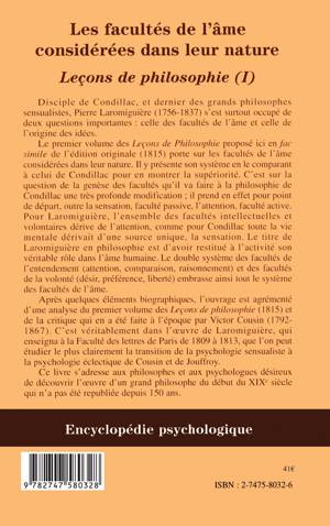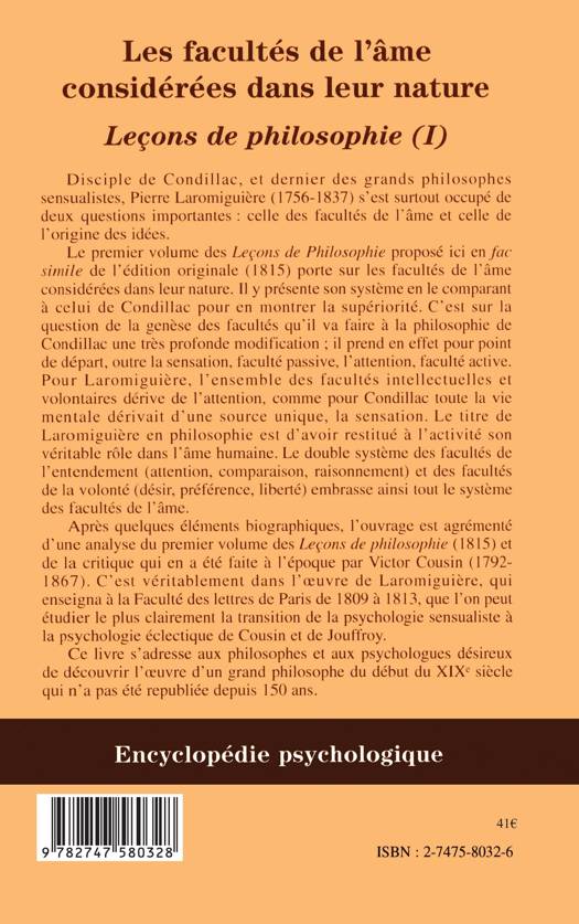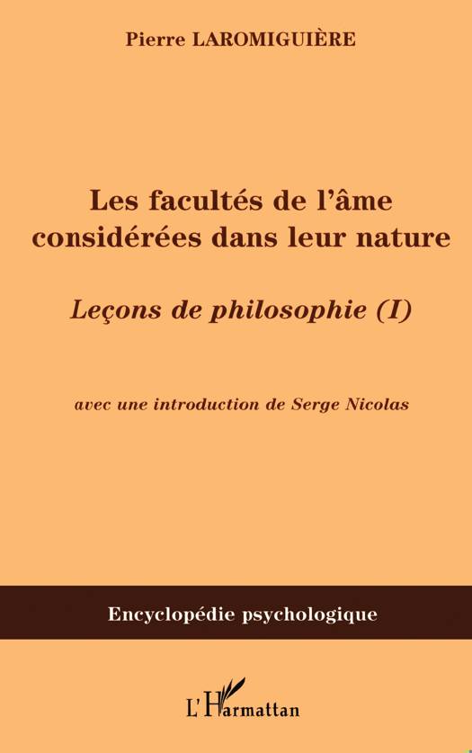Le premier volume des Leçons de Philosophie (1815) porte sur les facultés de l'âme considérées dans leur nature. Pierre Laromiguière (1756-1837) y présente son système en le comparant à celui de Condillac pour en montrer la supériorité. C'est sur la question de la genèse des facultés qu'il va faire à la philosophie de Condillac une très profonde modification ; il prend en effet pour point de départ, outre la sensation, faculté passive, l'attention, faculté active. Le titre de Laromiguière en philosophie est d'avoir restitué à l'activité son véritable rôle dans l'âme humaine.