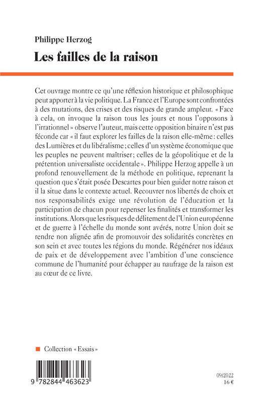 Cet ouvrage montre ce qu'une réflexion historique et philosophique peut apporter à la vie politique. La France et l'Europe sont confrontées à des mutations, des crises et des risques de grande ampleur. « Face à cela, on invoque la raison tous les jours et nous l'opposons à l'irrationnel » observe l'auteur, mais cette opposition binaire n'est pas féconde car « il faut explorer les failles de la raison elle-même : celles des Lumières et du libéralisme ; celles d'un système économique que les peuples ne peuvent maîtriser ; celles de la géopolitique et de la prétention universaliste occidentale ». Philippe Herzog appelle à un profond renouvellement de la méthode en politique, reprenant la question que s'était posée Descartes pour bien guider notre raison et il la situe dans le contexte actuel. Recouvrer nos libertés de choix et nos responsabilités exige une révolution de l'éducation et la participation de chacun pour repenser les finalités et transformer les institutions. Alors que les risques de délitement de l'Union européenne et de guerre à l'échelle du monde sont avérés, notre Union doit se rendre non alignée afin de promouvoir des solidarités concrètes en son sein et avec toutes les régions du monde. Régénérer nos idéaux de paix et de développement avec l'ambition d'une conscience commune de l'humanité pour échapper au naufrage de la raison est au cœur de ce livre.