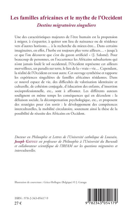 Pour les Africains subsahariens qui n'ont jamais foulé le sol occidental, l'Occident représente un ailleurs merveilleux, un paradis sur terre, le lieu de la « vraie » vie… Cependant, la réalité de l'Occident est tout autre. Cet ouvrage rapporte les expériences singulières de familles africaines résidantes. Dans ce nouvel espace de vie, des difficultés de valorisation identitaire et culturelle, de cohésion conjugale, d'éducation des enfants, d'insertion socioprofessionnelle, etc., sont à affronter.