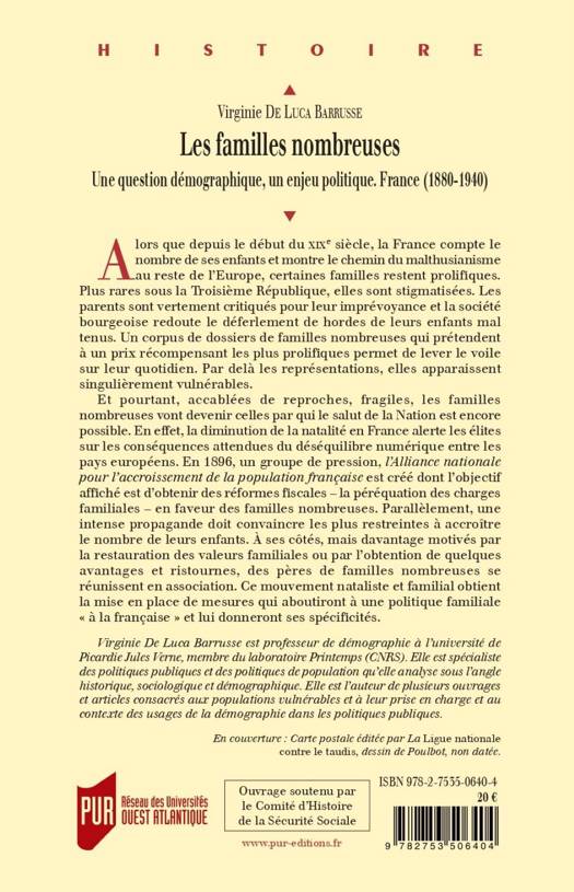 Alors que depuis le début du XIXe siècle, la France compte le nombre de ses enfants et montre le chemin du malthusianisme au reste de l’Europe, certaines familles restent prolifiques. Plus rares sous la Troisième République, elles sont stigmatisées. Les parents sont vertement critiqués pour leur imprévoyance et la société bourgeoise redoute le déferlement de hordes de leurs enfants mal tenus. Un corpus de dossiers de familles nombreuses qui prétendent à un prix récompensant les plus prolifiques permet de lever le voile sur leur quotidien. Par delà les représentations, elles apparaissent singulièrement vulnérables.