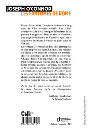 Février 1944. Les forces allemandes occupent Rome depuis six mois. Les combattants alliés ont débarqué à Anzio mais peinent à progresser. La Résistance s'organise autour de la filière d'évasion mise en place en plein coeur du Vatican par Hugh O'Flaherty et ses comparses. En première ligne : la Contessa Giovanna Landini, libre et intrépide, offrant un souffle féminin, flamboyant et plein d'humour à cette aventure haletante, où chaque ruelle cache un piège... et chaque choix peut coûter la vie. Excellente suite de "Dans la maison de mon père", nommé au Walter Scott Prize et au prix Historia, "Les Fantômes de Rome" confirme l'immense talent de conteur du maître du roman historique, Joseph O'Connor.