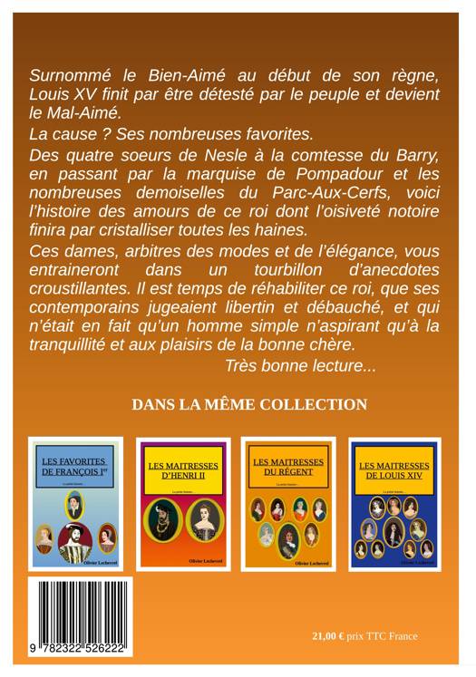 Traiter les galanteries des rois de France par l'humour et l'anecdotique. Voici les grands traits de la petite histoire galante en bande dessinée. Dans ce cinquième volume, il est question de Louis XV. Surnommé le Bien-Aimé au début de son règne, il finit par être détesté par le peuple et devient le Mal-Aimé. La cause ? Ses nombreuses favorites. Des quatre soeurs de Nesle à la comtesse du Barry, en passant par la marquise de Pompadour et les nombreuses demoiselles du Parc-Aux-Cerfs, voici l'histoire des amours de ce roi dont l'oisiveté notoire finira par cristalliser toutes les haines. Ces dames, arbitres des modes et de l'élégance, vous entraîneront dans un tourbillon d'anecdotes croustillantes. Il est temps de réhabiliter ce roi, que ses contemporains jugeaient libertin et débauché, et qui n'était en fait qu'un homme simple n'aspirant qu'à la tranquillité et aux plaisirs de la bonne chère.