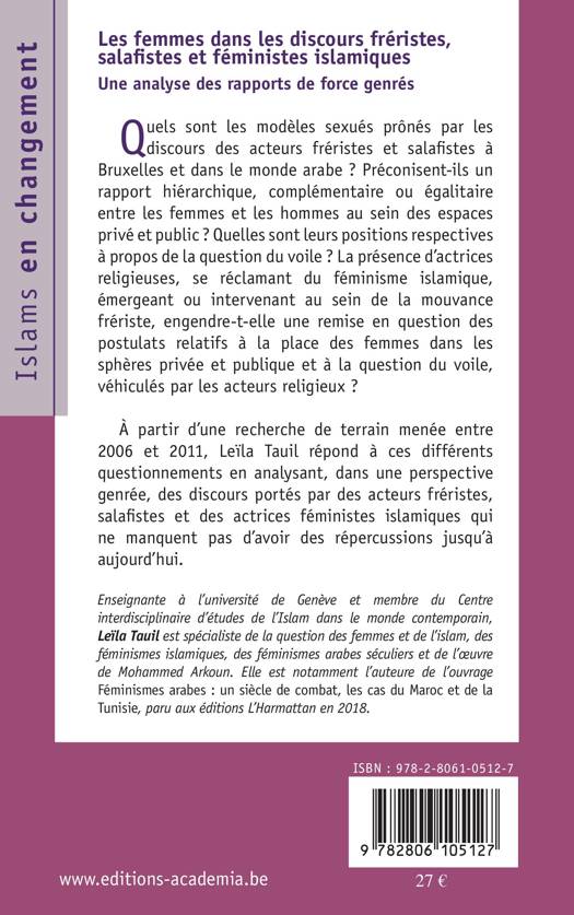 Quelle est la place des femmes, au sein des espaces privé et public, dans les discours des acteurs fréristes et salafistes et quelles sont leurs positions respectives à propos du voile ? La présence d'actrices féministes islamiques, intervenant au sein de la mouvance frériste, engendre-t-elle une remise en question des postulats véhiculés par les acteurs religieux ? À partir d'une recherche de terrain, Leïla Tauil répond à ces questionnements qui s'avèrent d'une grande actualité.