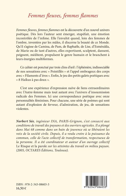 Femmes fleuves, femmes flammes est la découverte d'un nouvel univers poétique. Dès lors l'auteur sent émerger, stupéfait, cette émotion magique de l'infime. Une expérience d'expression naïve de liens singuliers avec l'Autre--femme mais tout autant avec l'ensemble de ce monde d'insoumission radicale.Qu'il s'agisse de Camina, de Lise, ou d'autres, elles expertisent, sculptent, dansent, peignent, propulsent le genre humain et le catapultent vers leurs énergies arc en ciel. Pour chacune, une série de poèmes qui sont autant d'explosion de ferveur, d'admiration et de jeu.