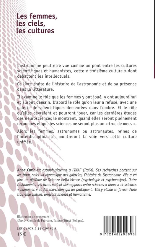 L'astronomie peut être vue comme un pont entre les cultures scientifiques et humanistes, cette « troisième culture » dont débattent les intellectuels. Ce livre traite de l'histoire de l'astronomie et de sa présence dans la littérature. Il examine le rôle que les femmes y ont joué, y ont aujourd'hui et auront demain. D'abord le rôle qu'on leur a refusé, avec une galerie de scientifiques demeurées dans l'ombre. Et le rôle qu'elles devraient et pourront jouer, car les dernières études des neurosciences le montrent, quand elles seront pleinement reconnues et que les sciences ne seront plus un « truc de mecs ». Alors les femmes, astronomes ou astronautes, reines de l'interdisciplinarité, montreront la voie vers cette culture unifiée.