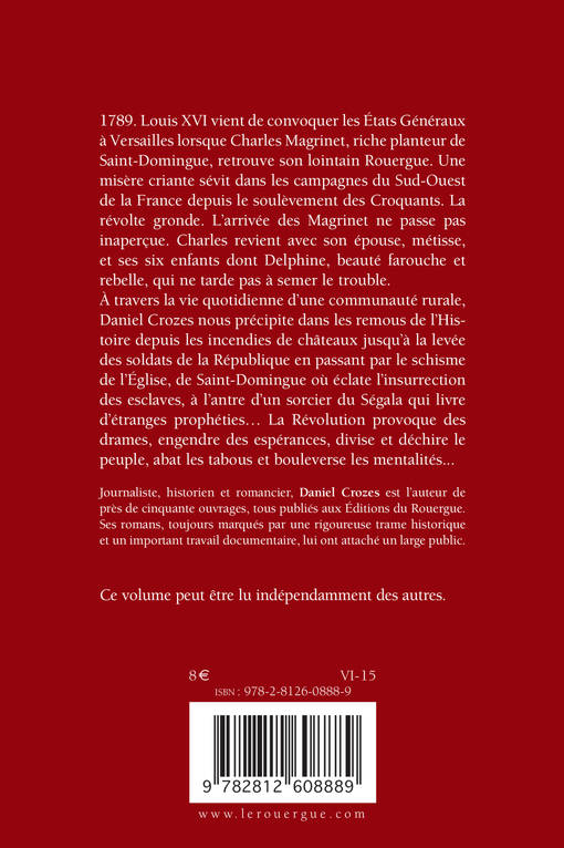 1789. Louis XVI vient de convoquer les Etats généraux à Versailles et Charles Magrinet, riche planteur de Saint-Domingue, retrouve son Rouergue natal. Il revient avec sa femme métisse et ses six enfants dont Delphine, beauté farouche, qui ne tarde pas à semer le trouble. Dans ce premier tome de La trilogie de la Révolution, Daniel Crozes nous raconte la Révolution, ses drames, ses espérances, la manière dont elle abat les tabous et bouleverse les mentalités.