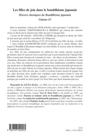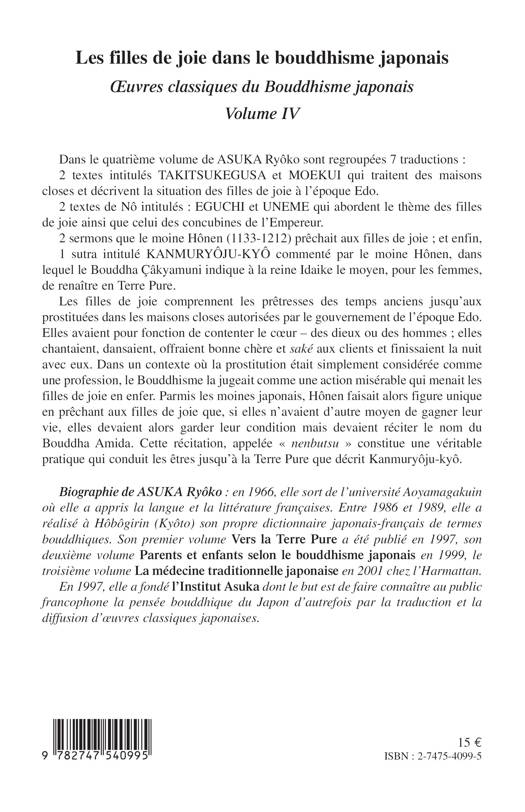 Dans ce dernier volume sept traductions sont regroupées : 2 textes intitulés TAKITSUKEGUSA et MOEKUI, 2 textes de Nô et 2 sermons commentés par le moine Hônen. Dans un contexte où la prostitution était simplement considérée comme une profession, le Bouddhisme la jugeait comme une action misérable qui menait les filles de joie en enfer. Parmi les moines japonais, Hônen faisait alors figure unique en prêchant aux filles de joies que, si elles n'avaient d'autre moyen de gagner leur vie, elles devaient alors garder leur condition mais devaient réciter le nom du Bouddha Amida.
