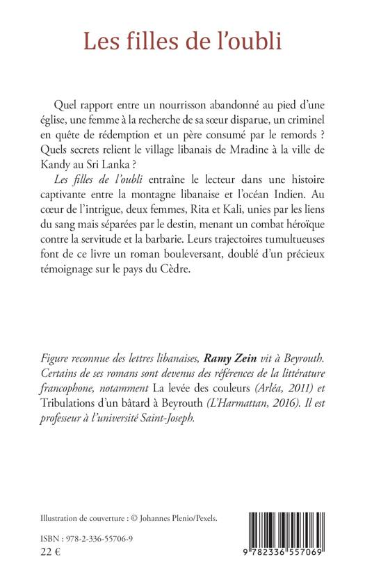 Quel rapport entre un nourrisson abandonné au pied d'une église, une femme à la recherche de sa soeur disparue, un criminel en quête de rédemption et un père consumé par le remords ? Quels secrets relient le village libanais de Mradine à la ville de Kandy au Sri Lanka ? Les filles de l'oubli entraîne le lecteur dans une histoire captivante entre la montagne libanaise et l'océan Indien. Au coeur de l'intrigue, deux femmes, Rita et Kali, unies par les liens du sang mais séparées par le destin, menant un combat héroïque contre la servitude et la barbarie. Leurs trajectoires tumultueuses font de ce livre un roman bouleversant, doublé d'un précieux témoignage sur le pays du Cèdre.