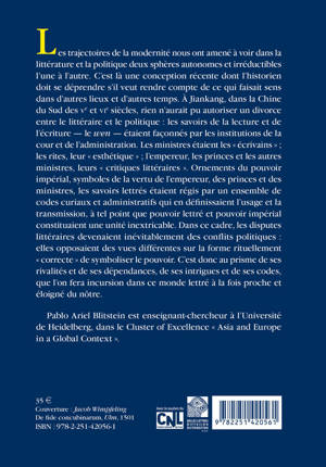 English summary: Although literature and politics are today two distinct fields, the present work explores the symbiotic relationship between them in the Jiankang court of Southern China in the fifth and sixth centuries. As an ornament of virtuous power, literature was an integral part of the institutions and discourses that surrounded the court. French description: Les partages disciplinaires modernes nous obligent a etudier la litterature et la politique comme si leur existence en tant que pratiques distinctes avait toujours existe. Or, notre litterature et notre politique modernes ne sont que des peripeties singulieres de notre histoire recente: elles ne sont pas plus singulieres, et peut-etre pas plus transitoires, que toutes les autres facons passees et presentes de concevoir l'ecriture et le pouvoir. La presente etude est precisement consacree a la facon aujourd'hui perdue de concevoir l'ecriture et le pouvoir: celle qui a pris place dans la cour de Jiankang dans la Chine du Sud entre le Ve et le VIe siecles. Il s'agit de montrer que, dans ce monde lettre, les savoirs de la lecture et de l'ecriture -- le wen -- sont definis par des institutions et des discours qui ne distinguent pas entre le litteraire et le politique; que ces savoirs, comme les discours et les institutions qui les regissent, n'echappent pas aux conflits specifiques de cette societe de cour; et que tout discours sur les lettres -- meme le plus apparemment litteraire -- est en meme temps un discours sur le pouvoir imperial: car le pouvoir imperial, concu comme une forme de vertu, cherche dans les lettres les ornements appropries pour le marquage de sa superiorite morale. Peut-etre que la distinction moderne entre litterature et politique n'aurait jamais existe sans ces mondes lettres ou les lettres ont ete l'ornement d'un pouvoir vertueux: il fallait passer par une elevation des lettres a symbole politique avant qu'on puisse venerer la litterature comme un art qui merite un espace propre.
