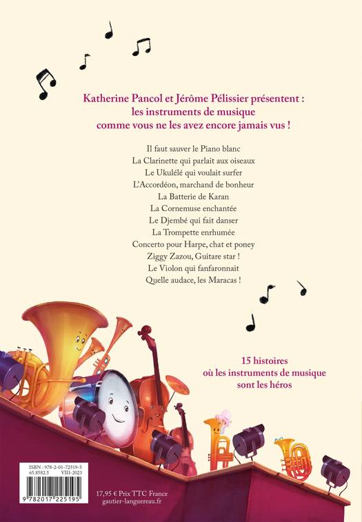 Il faut sauver le Piano blanc La Clarinette qui parlait aux oiseaux Le Ukulélé qui voulait surfer L’Accordéon, marchand de bonheur La Batterie de Karan La Cornemuse enchantée Le Djembé qui fait danser La Trompette enrhumée Concerto pour Harpe, chat et poney Ziggy, Zazou, Guitare star ! Le Violon qui fanfaronnait Quelle audace, les Maracas !