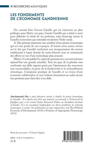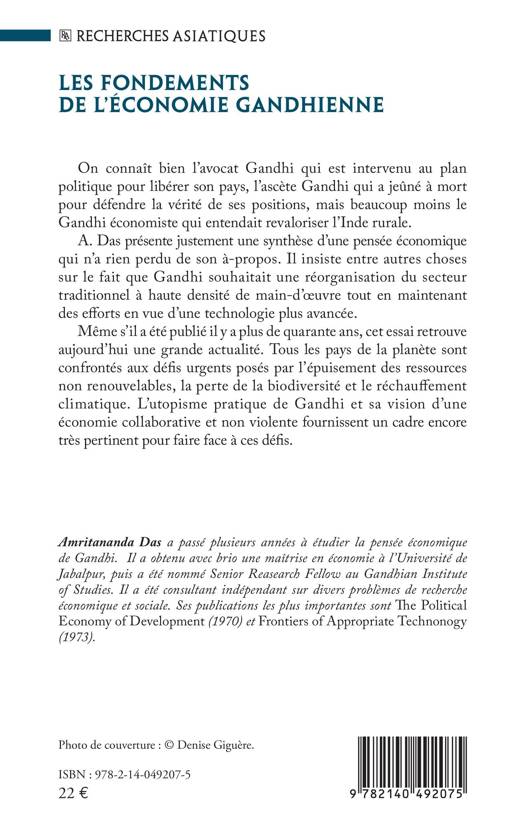 On connaît bien l’avocat Gandhi qui est intervenu au plan politique pour libérer son pays, l’ascète Gandhi qui a jeûné à mort pour défendre la vérité de ses positions, mais beaucoup moins le Gandhi économiste qui entendait revaloriser l’Inde rurale. L'auteur présente une synthèse d’une pensée économique qui n’a rien perdu de son à-propos. Il insiste entre autres choses sur le fait que Gandhi souhaitait une réorganisation du secteur traditionnel à haute densité de main-d’oeuvre tout en maintenant des efforts en vue d’une technologie plus avancée. Publié il y a plus de quarante ans en anglais, cet essai reste d'actualité. Tous les pays de la planète sont confrontés aux défis urgents posés par l’épuisement des ressources non renouvelables, la perte de la biodiversité et le réchauffement climatique. L’utopisme pratique de Gandhi et sa vision d’une économie collaborative et non violente fournissent un cadre encore très pertinent pour faire face à ces défis.