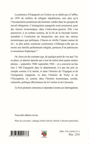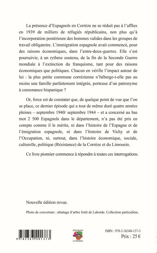 La présence d’Espagnols en Corrèze ne se réduit pas à l’afflux en 1939 de milliers de réfugiés républicains, non plus qu’à l’incorporation postérieure des hommes valides dans les groupes de travail obligatoire. L’immigration espagnole avait commencé, pour des raisons économiques, dans l’entre-deux-guerres. Elle s’est poursuivie, à un rythme soutenu, de la fin de la Seconde Guerre mondiale à l’extinction du franquisme, tant pour des raisons économiques que politiques. Chacun en vérifie l’impact autour de lui : la plus petite commune corrézienne n’héberge-t-elle pas au moins une famille parfaitement intégrée, porteuse d’un patronyme à consonance hispanique ? Or, force est de constater que, de quelque point de vue que l’on se place, ce dernier épisode qui a tout de même duré quatre années pleines – septembre 1940/ septembre 1944 – et a concerné au bas mot 2 500 Espagnols dans le département, n’a pas été pris en compte comme il le mérite, ni dans l’histoire de l’Espagne et de l’émigration espagnole, ni dans l’histoire de Vichy et de l’Occupation, ni, surtout, dans l’histoire économique, sociale, culturelle, politique (Résistance) de la Corrèze et du Limousin. Ce livre pionnier commence à répondre à toutes ces interrogations.