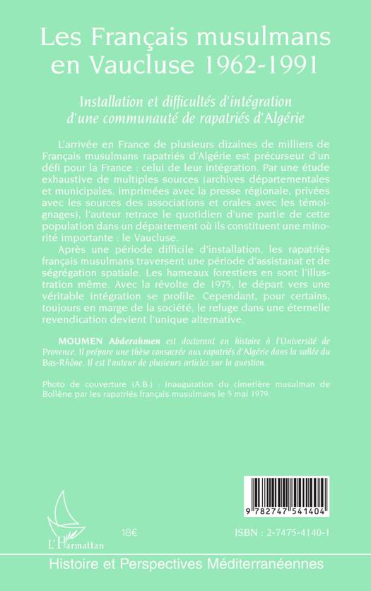 L'arrivée en de plusieurs dizaines de milliers de Français musulmans rapatriés d'Algérie est précurseur d'un défi pour la France: celui de leur intégration. Par une étude exhaustive de multiples sources (archives, presse, témoignages, associations), l'auteur retrace le quotidien d'une partie de cette population dans un département où ils constituent une minorité importante: le Vaucluse.