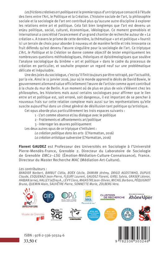 Cet ouvrage est le troisième opus d'un triptyque consacré à l'étude des liens entre l'Art, le Politique et la Création. L'art est devenu un enjeu politique, social, culturel, économique, idéologique. À un moment où de plus en plus de voix s'élèvent pour affirmer que le lien entre art et politique est, soit erroné, soit dangereux, il importe de se pencher à nouveau sur cette relation complexe et sur les représentations qu'elle suscite aujourd'hui dans un climat de désillusion tant politique qu'artistique. Cet opus aborde : l'art comme absence et/ou dialogue avec le politique, les frottements et affrontements art/politique, l'interrogation politique des uvres.