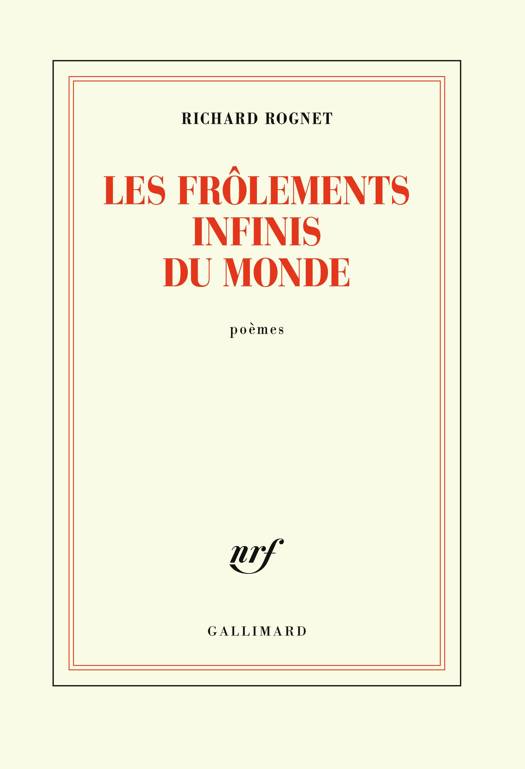 Richard Rognet est sans doute un de nos derniers et de nos meilleurs poètes élégiaques. Ses Frôlements infinis du monde sont tout entiers baignés par le sentiment de la Nature que le poète interroge et qui l'éclaire et le console de la solitude et de la mort qui rôde. C'est un seul long poème en vers libres, une sorte de méditation écrite dans une langue très simple et très souple, et d'une grande douceur mélancolique. On est loin ici de tous les modernismes contemporains, et cependant au coeur même de la poésie.