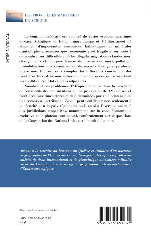 Le continent africain est entouré de vastes espaces maritimes (océans Atlantique et Indien, mers Rouge et Méditerranée) où abondent d'importantes ressources halieutiques et minérales d'autant plus précieuses que l'économie y est fragile et en proie à de nombreuses difficultés pêche illégale, migrations clandestines, changements climatiques, hausse du niveau des mers, pollution, immobilisation et arraisonnement de navires étrangers, piraterie, terrorisme. Et c'est sans compter les différends concernant des frontières terrestres non entièrement démarquées qui exacerbent les conflits entre États à côtes adjacentes. Nonobstant ces problèmes, l'Afrique demeure dans la moyenne de l'ensemble des continents avec une proportion de 42% de ses 71 frontières maritimes d'ores et déjà délimitées par voie bilatérale ou par recours à un tribunal. Ce qui peut contribuer non seulement à la sécurité et à la paix régionales mais aussi à l'exercice ordonné des juridictions respectives, notamment sur la zone économique exclusive et le plateau continental, conformément aux dispositions de la Convention des Nations Unies sur le droit de la mer.
