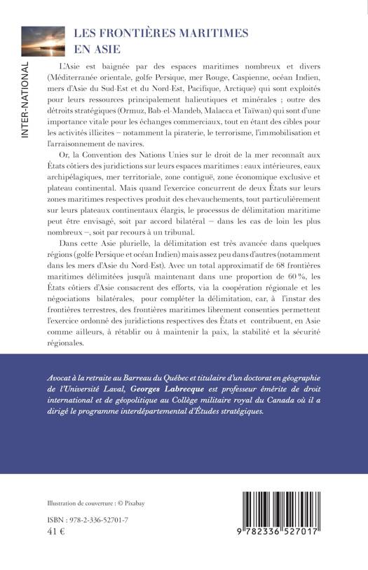 L'Asie est baignée par des espaces maritimes nombreux et divers qui sont exploités pour leurs ressources principalement halieutiques et minérales; outre des détroits stratégiques qui sont d'une importance vitale pour les échanges commerciaux, tout en étant des cibles pour les activités illicites - notamment la piraterie, le terrorisme, l'immobilisation et l'arraisonnement de navires. Or, la Convention des Nations Unies sur le droit de la mer reconnaît aux États côtiers des juridictions sur leurs espaces maritimes eaux intérieures, eaux archipélagiques, mer territoriale, zone contiguë, zone économique exclusive et plateau continental. Mais quand l'exercice concurrent de deux États sur leurs zones maritimes respectives produit des chevauchements, tout particulièrement sur leurs plateaux continentaux élargis, le processus de délimitation maritime peut être envisagé, soit par accord bilatéral - dans les cas de loin les plus nombreux -, soit par recours à un tribunal. Dans cette Asie plurielle, la délimitation est très avancée dans quelques régions (golfe Persique et océan Indien) mais assez peu dans d'autres (notamment dans les mers d'Asie du Nord-Est). Avec un total approximatif de 68 frontières maritimes délimitées jusqu'à maintenant dans une proportion de 60 %, les États côtiers d'Asie consacrent des efforts, via la coopération régionale et les négociations bilatérales, pour compléter la délimitation, car, à l'instar des frontières terrestres, des frontières maritimes librement consenties permettent l'exercice ordonné des juridictions respectives des États et contribuent, en Asie comme ailleurs, à rétablir ou à maintenir la paix, la stabilité et la sécurité régionales.