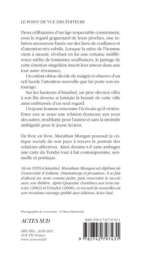Deux célibataires d'un âge respectable construisent, sous le regard goguenard de leurs proches, une relation amoureuse basée sur des liens de confiance et d'attention très subtils. Lorsque la mère de l'homme vient à mourir, révélant en lui une certaine indifférence mêlée de lointaines souffrances, le partage de cette émotion singulière inscrit leur amour dans une tout autre résonance. Un enfant obèse décide de maigrir et observe d'un oeil lucide l'attention nouvelle que lui porte son entourage. Sur les hauteurs d'Istanbul, un père divorcé offre à son fils devenu si lointain la beauté de cette ville ainsi embrassée d'un seul regard. Un jeune homme rencontre l'écrivain qu'il vénère. Entre eux se noue une relation douteuse aux yeux des autres, troublante pour l'auteur et sans la moindre ambiguïté pour le jeune lecteur. De livre en livre, Murathan Mungan poursuit la critique sociale de son pays à travers le portrait des relations affectives. Ainsi dessine-t-il sans ambages une carte du Tendre tout à fait contemporaine, sensuelle et poétique.