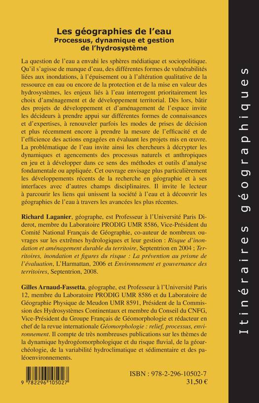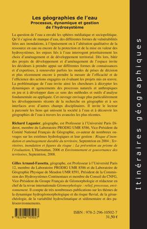 La problématique de l'eau a envahi les sphères médiatiques et sociologiques, qu'il s'agisse du manque d'eau, des différentes formes de vulnérabilité liées aux inondations, à l'épuisement ou à l'altération qualitative de la ressource en eau, ou encore de la protection et de la mise en valeur des hydrosystèmes. Cet ouvrage invite le lecteur à parcourir les lieux qui unissent la société à l'eau et à découvrir les géographies de l'eau à travers les avancées les plus récentes.