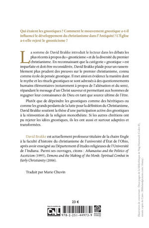 La somme de David Brakke introduit le lecteur dans les debats les plus recents a propos du " gnosticisme " et de la diversite du premier christianisme. En reconnaissant que la categorie " gnostique " est imparfaite et doit etre reconsideree, David Brakke plaide pour un rassemblement plus prudent des preuves sur le premier christianisme, connu comme ecole de pensee gnostique. Il met ainsi en evidence la maniere dont le mythe et les rituels gnostiques se sont adresses a des questionnements humains elementaires (notamment a propos de l'alienation et du sens), repandant le message d'un Christ sauveur et permettant aux hommes de regagner leur connaissance de Dieu en tant que source ultime de l'etre. Plutot que de depeindre les gnostiques comme des heretiques ou comme les grands perdants de la lutte pour la definition du Christianisme, David Brakke soutient la these d'une participation active des gnostiques a la reinvention de la religion monotheiste. Si les autres chretiens ont pu rejeter les idees gnostiques, ils les ont aussi et surtout adaptees et transformees.