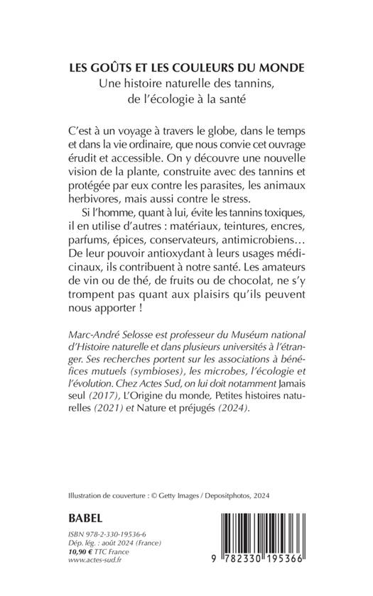 C'est à un voyage à travers le globe, dans le temps et dans la vie ordinaire, que nous convie cet ouvrage érudit et accessible. On y découvre une nouvelle vision de la plante, construite avec des tannins et protégée par eux contre les parasites, les animaux herbivores, mais aussi contre le stress. Si l'homme, quant à lui, évite les tannins toxiques, il en utilise d'autres : matériaux, teintures, encres, parfums, épices, conservateurs, antimicrobiens... De leur pouvoir antioxydant à leurs usages médicinaux, ils contribuent à notre santé. Les amateurs de vin ou de thé, de fruits ou de chocolat, ne s'y trompent pas quant aux plaisirs qu'ils peuvent nous apporter !