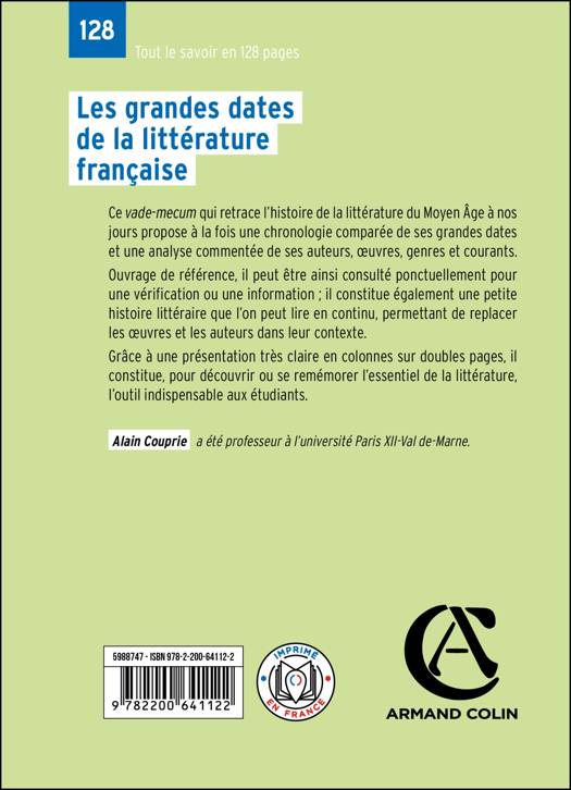 Ce vade-mecum qui retrace l’histoire de la littérature du Moyen Âge à nos jours propose à la fois une chronologie comparée de ses grandes dates et une analyse commentée de ses auteurs, œuvres, genres et courants. Ouvrage de référence, il peut être ainsi consulté ponctuellement pour une vérification ou une information ; il constitue également une petite histoire littéraire que l’on peut lire en continu, permettant de replacer les œuvres et les auteurs dans leur contexte. Grâce à une présentation très claire en colonnes sur doubles pages, il constitue, pour découvrir ou se remémorer l’essentiel de la littérature, l’outil indispensable aux étudiants.