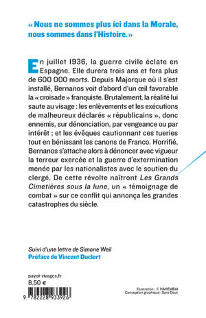 En juillet 1936, la guerre civile éclate en Espagne. Elle durera trois ans, faisant plus de 600 000 morts. Depuis Majorque où il s'est installé, Bernanos voit d'abord d'un oeil favorable la « croisade » franquiste. Brutalement, la réalité lui saute au visage : les enlèvements et les exécutions de malheureux déclarés « républicains », donc ennemis, sur dénonciation, par vengeance ou par intérêt ; et les évêques cautionnant ces tueries tout en bénissant les canons de Franco. Horrifié, Bernanos s'attache alors à dénoncer avec vigueur la terreur exercée et la guerre d'extermination menée par les nationalistes avec le soutien du clergé. De cette révolte naîtront "Les Grands Cimetières sous la lune", un « témoignage de combat » sur ce conflit qui annonça les grandes catastrophes du siècle.