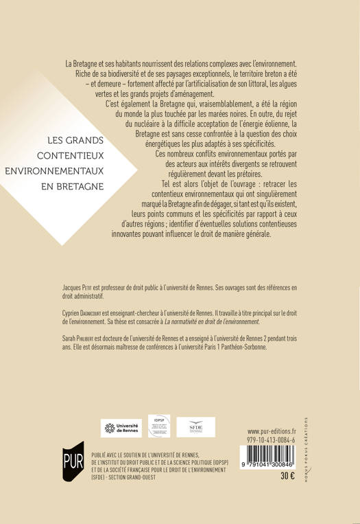 La Bretagne et ses habitants nourrissent des relations complexes avec l’environnement. Riche de sa biodiversité et de ses paysages exceptionnels, le territoire breton a été – et demeure – fortement affecté par l’artificialisation de son littoral, les algues vertes et les grands projets d’aménagement. C’est également la Bretagne qui, vraisemblablement, a été la région du monde la plus touchée par les marées noires. En outre, du rejet du nucléaire à la difficile acceptation de l’énergie éolienne, la Bretagne est sans cesse confrontée à la question des choix énergétiques les plus adaptés à ses spécificités. Ces nombreux conflits environnementaux portés par des acteurs aux intérêts divergents se retrouvent régulièrement devant les prétoires. Tel est alors l’objet de l’ouvrage : retracer les contentieux environnementaux qui ont singulièrement marqué la Bretagne afin de dégager, si tant est qu’ils existent, leurs points communs et les spécificités par rapport à ceux d’autres régions ; identifier d’éventuelles solutions contentieuses innovantes pouvant influencer le droit de manière générale.