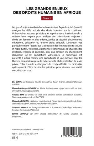 Les grands enjeux des droits humains en Afrique: Regards croisés (Tome 1) souligne les défis actuels des droits humains sur le continent. Universitaires, experts, praticiens et représentants institutionnels y croisent leurs regards pour analyser des thématiques majeures: droits des femmes et des enfants, justice et sécurité, gouvernance, migrations, éducation ou encore droits culturels. L'ouvrage met particulièrement l'accent sur la condition des femmes (droits sexuels et reproductifs, violences, autonomie économique), la situation des déplacés, réfugiés et apatrides, ainsi que l'impact du changement climatique sur les populations vulnérables. Le numérique est présenté à la fois comme une opportunité et une menace pour les libertés, posant des enjeux de cybersécurité et de protection de la vie privée. Enfin, il insiste sur l'urgence de rendre effectifs ces droits afin qu'ils cessent d'être de simples principes pour devenir une réalité concrète pour tous.