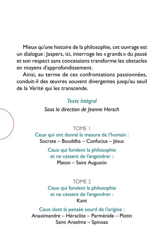 Mieux qu’une histoire de la philosophie, cet ouvrage est un dialogue : Jaspers, ici, interroge les « grands » du passé et son respect sans concessions transforme les obstacles en moyens d’approfondissement. Ainsi, au terme de ces confrontations passionnées, conduit-il des oeuvres souvent divergentes jusqu’au seuil de la Vérité qui les transcende.