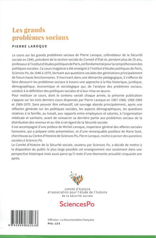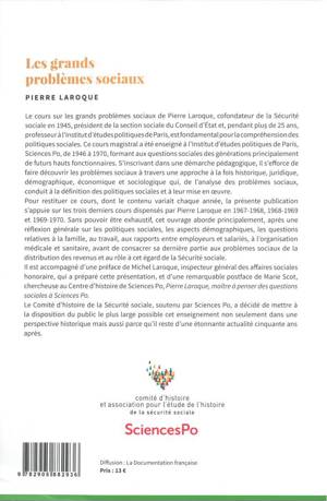 Le cours sur les grands problèmes sociaux de Pierre Laroque, cofondateur de la Sécurité sociale en 1945, président de la section sociale du Conseil d'État et, pendant plus de 25 ans, professeur à l'Institut d'études politiques de Paris, est fondamental pour la compréhension des politiques sociales. Ce cours magistral a été enseigné à l'Institut d'études politiques de Paris, Sciences Po, de 1946 à 1970, formant aux questions sociales des générations principalement de futurs hauts fonctionnaires. S'inscrivant dans une démarche pédagogique, il s'efforce de faire découvrir les problèmes sociaux à travers une approche à la fois historique, juridique, démographique, économique et sociologique qui, de l'analyse des problèmes sociaux, conduit à la définition des politiques sociales et à leur mise en oeuvre.