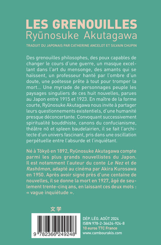 Des grenouilles philosophes, des poux capables de changer le cours d'une guerre, un masque excellant dans l'art du mensonge, des amants qui se haïssent, un professeur hanté par l'ombre d'un doute, une poétesse prête à tout pour tromper la mort... Une myriade de personnages peuple les paysages singuliers de ces huit nouvelles, parues au Japon entre 1915 et 1923. En maître de la forme courte, Ryūnosuke Akutagawa nous invite à partager leurs questionnements existentiels, d'une humanité presque déconcertante. Convoquant successivement spiritualité bouddhiste, canons du confucianisme, théâtre nō et spleen baudelairien, il se fait l'architecte d'un univers fascinant, pris dans une oscillation perpétuelle entre l'absurde et l'inquiétant.