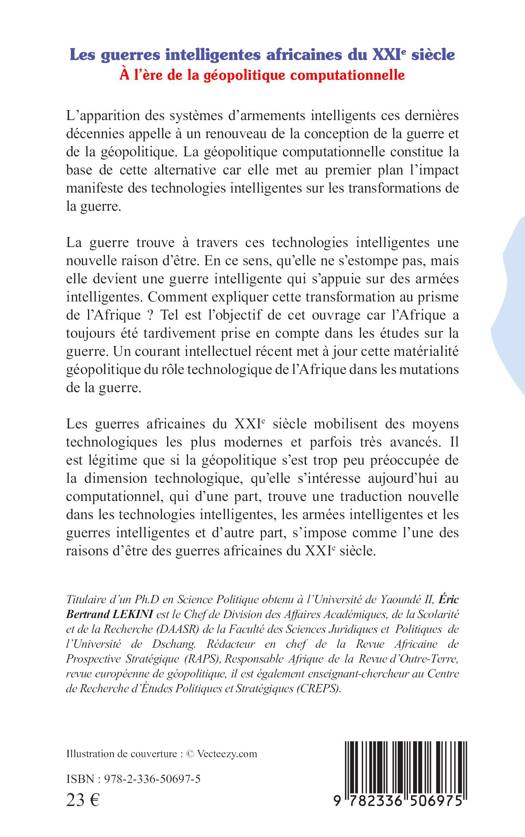 L'apparition des systèmes d'armements intelligents ces dernières décennies appelle à un renouveau de la conception de la guerre et de la géopolitique. La géopolitique computationnelle constitue la base de cette alternative car elle met au premier plan l'impact manifeste des technologies intelligentes sur les transformations de la guerre. La guerre trouve à travers ces technologies intelligentes une nouvelle raison d'être. En ce sens, qu'elle ne s'estompe pas, mais elle devient une guerre intelligente qui s'appuie sur des armées intelligentes. Comment expliquer cette transformation au prisme de l'Afrique ? Tel est l'objectif de cet ouvrage car l'Afrique a toujours été tardivement prise en compte dans les études sur la guerre. Un courant intellectuel récent met à jour cette matérialité géopolitique du rôle technologique de l'Afrique dans les mutations de la guerre. Les guerres africaines du XXIe siècle mobilisent des moyens technologiques les plus modernes et parfois très avancés. Il est légitime que si la géopolitique s'est trop peu préoccupée de la dimension technologique, qu'elle s'intéresse aujourd'hui au computationnel, qui d'une part, trouve une traduction nouvelle dans les technologies intelligentes, les armées intelligentes et les guerres intelligentes et d'autre part, s'impose comme l'une des raisons d'être des guerres africaines du XXIe siècle.