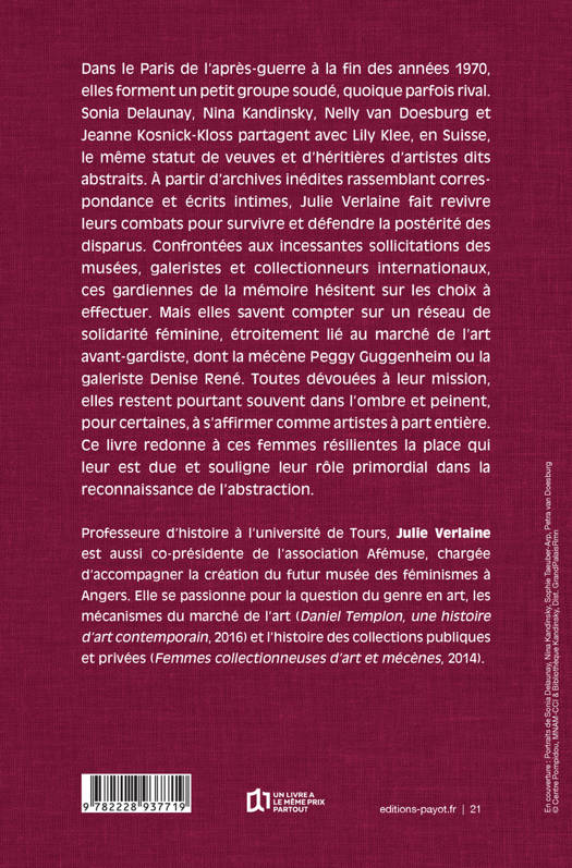 Dans le Paris de l'après-guerre à la fin des années 1970, elles forment un petit groupe soudé, quoique parfois rival. Sonia Delaunay, Nina Kandinsky, Nelly van Doesburg et Jeanne Kosnick-Kloss partagent avec Lily Klee, en Suisse, le même statut de veuves et d'héritières d'artistes dits abstraits. À partir d'archives inédites rassemblant correspondance et écrits intimes, Julie Verlaine fait revivre leurs combats pour survivre et défendre la postérité des disparus. Confrontées aux incessantes sollicitations des musées, galeristes et collectionneurs internationaux, ces gardiennes de la mémoire hésitent sur les choix à effectuer. Mais elles savent compter sur un réseau de solidarité féminine, étroitement lié au marché de l'art avant-gardiste, dont la mécène Peggy Guggenheim ou la galeriste Denise René. Toutes dévouées à leur mission, elles restent pourtant souvent dans l'ombre et peinent, pour certaines, à s'affirmer comme artistes à part entière. Ce livre redonne à ces femmes résilientes la place qui leur est due et souligne leur rôle primordial dans la reconnaissance de l'abstraction.
