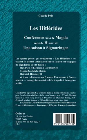 Les quatre pièces qui constituent "Les Hitlérides" retracent les destins volontairement ou fatalement tragiques de dignitaires du IIIe Reich : Heydrich et Eichmann (Conférence) ; Magda Goebbels (Magda) ; Heinrich Himmler (H) ; et leurs collaborateurs français (Une saison à Sigmaringen) passage involontaire de la tragédie à la tragi-comédie...