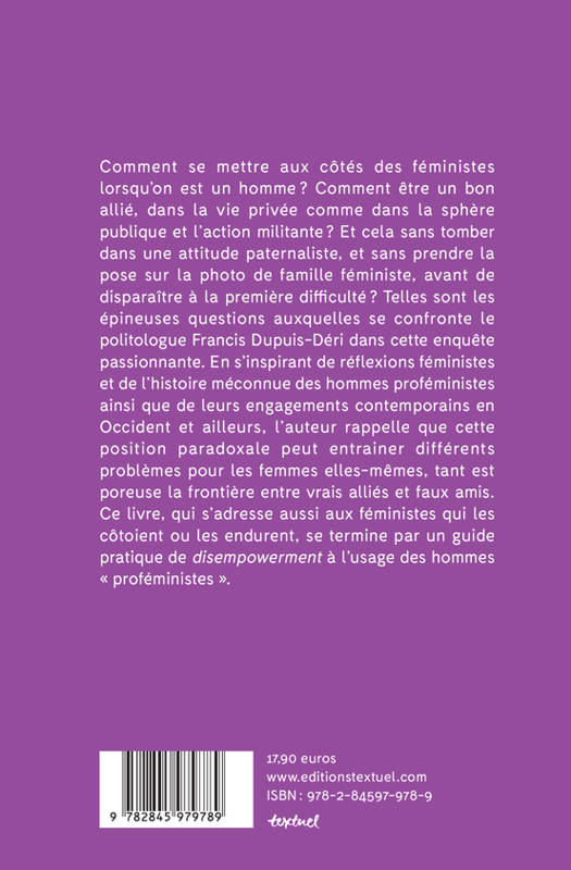 Comment être un bon allié du féminisme quand on est un homme ? Comment inventer une masculinité émancipatrice pour en finir avec la masculinité toxique ? Pourquoi les hommes eux-mêmes ont intérêt à lutter contre le patriarcat ? C'est de ces questions épineuses que s'empare le sociologue proféministe Francis Dupuis-Déri. En tirant le bilan critique de plus d'un siècle d'expériences où la frontière entre faux-amis et alliés est souvent poreuse, il esquisse les pistes d'un féminisme au masculin.