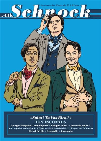 Si vous aussi, vous ressentez l'envie d'échapper à l'hystérie de l'époque en faisant un pas de côté et en tournant poliment le dos au jeunisme ambiant, cette revue est faite pour vous. Elle vous fera replonger dans des œuvres parfois oubliées, rencontrer des personnages hauts en couleur, mémoires encore vivaces de notre patrimoine culturel, vous permettant ainsi de satisfaire vos goûts de jeune (ou vieux) schnock. Ni rétrograde, ni passéiste. Schnock, donc. Tout bonnement. Alors rejoignez-nous ! Après vous...