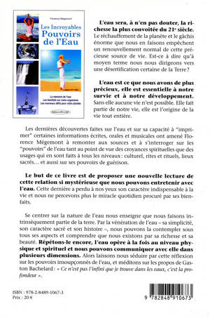 L'eau sera, à n'en pas douter, la richesse la plus convoitée du 21e siècle. Le réchauffement de la planète et le gâchis énorme que nous en faisons empêchent un renouvellement normal de cette précieuse source de vie. Est-ce à dire qu'à moyen terme nous nous dirigeons vers une désertification certaine de la Terre ? L'eau est ce que nous avons de plus précieux, elle est essentielle à notre survie et à notre développement. Sans elle aucune vie n'est possible. Elle fait partie de notre vie, elle est l'origine de la vie tout entière. Les dernières découvertes faites sur l'eau et sur sa capacité à "imprimer" certaines informations écrites, orales et musicales ont amené Florence Mégemont à remonter aux sources et à s'interroger sur les "pouvoirs" de l'eau tant au point de vue des croyances spirituelles que des usages qui en sont faits à tous les niveaux : culturel, rites et rituels, lieux sacrés... et aussi sur ses pouvoirs de guérison. Le but de ce livre est de proposer une nouvelle lecture de cette relation si mystérieuse que nous pouvons entretenir avec l'eau. Cette dernière a perdu à nos yeux son caractère indispensable à la vie et nous ne percevons plus le miracle quotidien procuré par ses bienfaits. Se centrer sur la nature de l'eau nous enseigne que nous faisons intrinsèquement partie de la terre. Par la vénération de l'eau - sa simplicité, son caractère sacré et son histoire -, nous pouvons la contempler sous tous ses aspects et comprendre que nous existons par sa richesse et sa beauté. Répétons-le encore, l'eau opère à la fois au niveau physique et spirituel et nous pouvons communiquer avec elle dans plusieurs dimensions. Alors laissons nous séduire par cette réflexion sur les pouvoirs insoupçonnés de l'eau, et méditons sur les propos de Gaston Bachelard : " Ce n'est pas l'infini que je trouve dans les eaux, c'est la profondeur ".