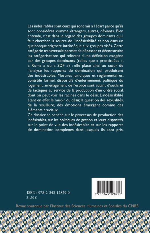 Les indésirables sont ceux qui sont mis à l'écart parce qu'ils sont considérés comme étrangers, autres, déviants. Bien entendu, c'est dans le regard des groupes dominants qu'il faut chercher la source de l'indésirabilité et non dans un quelconque stigmate intrinsèque aux groupes visés. Ce dossier se penche sur le processus de production des indésirables, sur les politiques de gestion et leurs dispositifs, sur le point de vue des indésirables et sur les rapports de domination complexes dans lequels ils sont pris.
