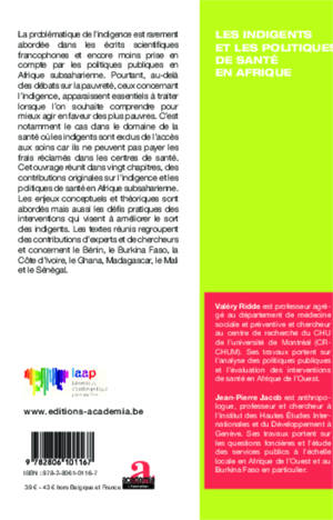 Au-delà des enjeux liés à la question de la pauvreté, cet ouvrage traite de la problématique de l'indigence en relation avec les politiques de santé et avec les politiques publiques en Afrique sub-saharienne. L'ouvrage réunit les contributions de chercheurs et intervenants préoccupés par le développement des connaissances sur l'indigence et la santé, tant d'un point de vue conceptuel et historique que pour relever les défis des interventions en faveur des plus pauvres.