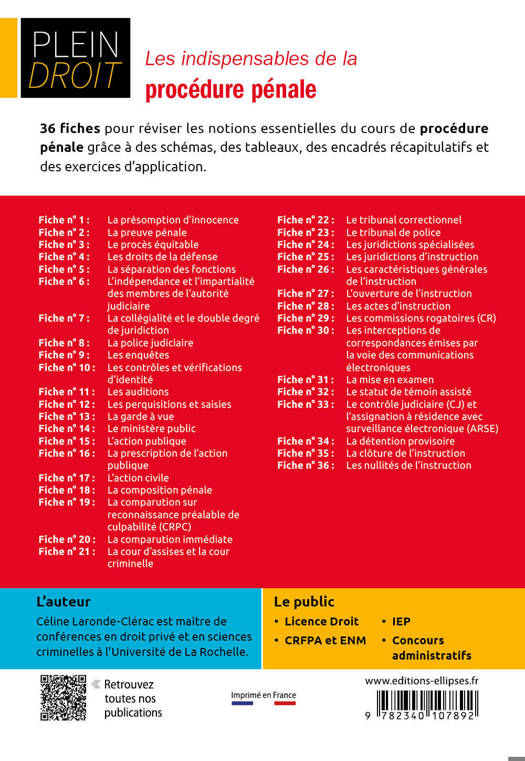 36 fiches pour réviser les notions essentielles du cours de la procédure pénale grâce à des schémas, des encadrés récapitulatifs et des exercices d’application corrigés.