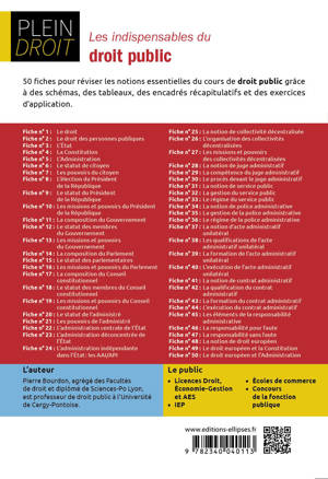 Cinquante fiches de synthèse présentant les notions essentielles en droit public, comprenant des schémas, des tableaux, des encadrés récapitulatifs et des exercices d'application corrigés.