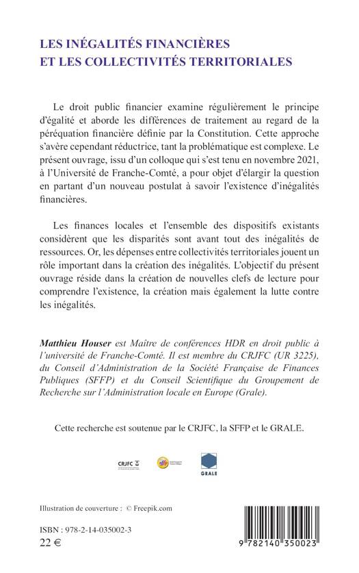 Le droit public financier examine régulièrement le principe d'égalité et aborde les différences de traitement au regard de la péréquation financière définie par la Constitution. Cette approche s'avère cependant réductrice, tant la problématique est complexe. Cet ouvrage, issu d un colloque qui s'est tenu en novembre 2021, à l'Université de Franche-Comté, a pour objet d'élargir la question en partant d un nouveau postulat à savoir l'existence d'inégalités financières. Les finances locales et l'ensemble des dispositifs existants considèrent que les disparités sont avant tout des inégalités de ressources. Or, les dépenses entre collectivités territoriales jouent un rôle important dans la création des inégalités. Cette réflexion vise à créer de nouvelles clefs de lecture pour comprendre l'existence, la création mais également la lutte contre les inégalités.