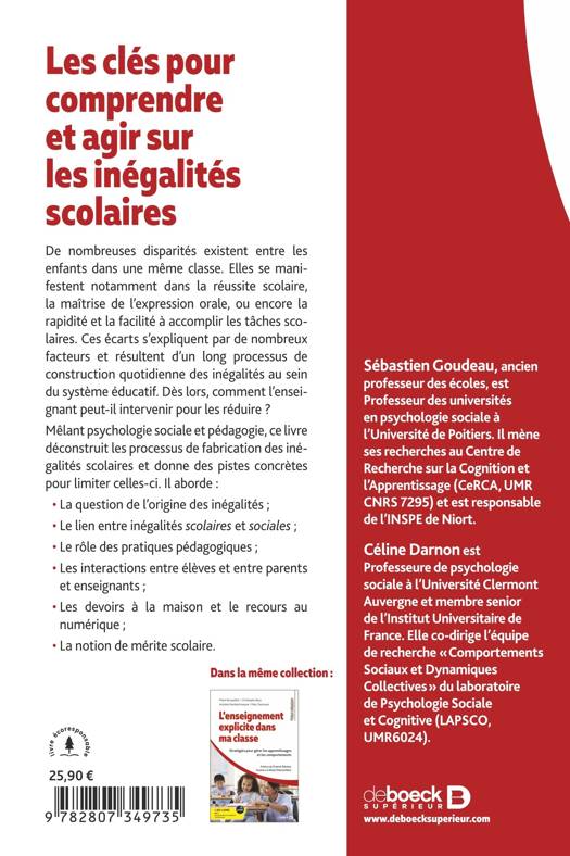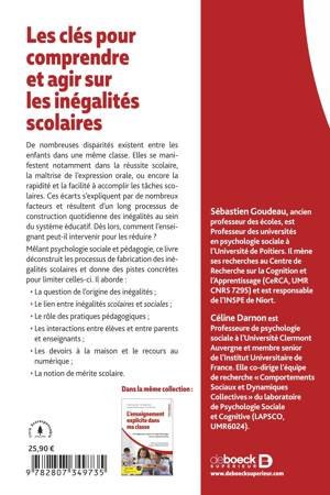 Mêlant psychologie sociale et pédagogie, ce livre déconstruit les processus de fabrication des inégalités scolaires et donne des pistes concrètes pour limiter celles-ci. Il aborde :