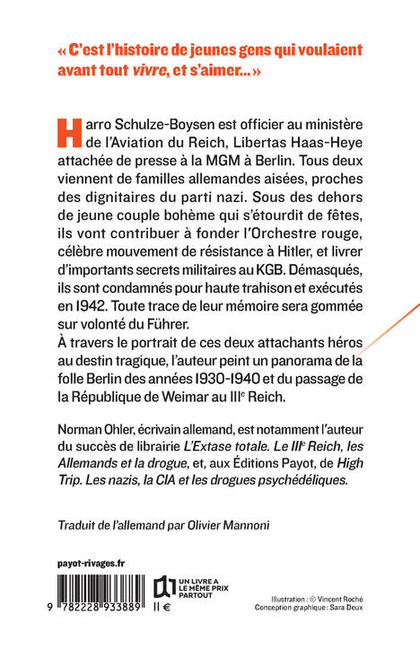 Harro et Libertas Schulze-Boysen, couple d'espions allemands infiltrés dans l'administration du Reich et à la solde de l'Union soviétique, furent à l'origine de l'Orchestre rouge de Berlin, le mouvement de résistance à Hitler. Ils furent exécutés par les nazis en 1942. Leur histoire est racontée par Norman Ohler, auteur du best-seller "L'extase totale. Le IIIe Reich, les Allemands et la drogue".