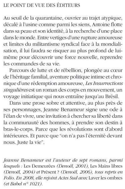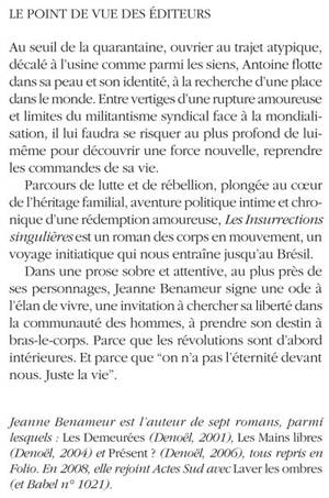 Parcours de lutte et de rébellion, plongée au coeur de l'héritage familial, aventure politique intime et chronique d'une rédemption amoureuse, «Les Insurrections singulières» est un roman des corps en mouvement, un voyage initiatique qui nous entraîne jusqu'au Brésil.