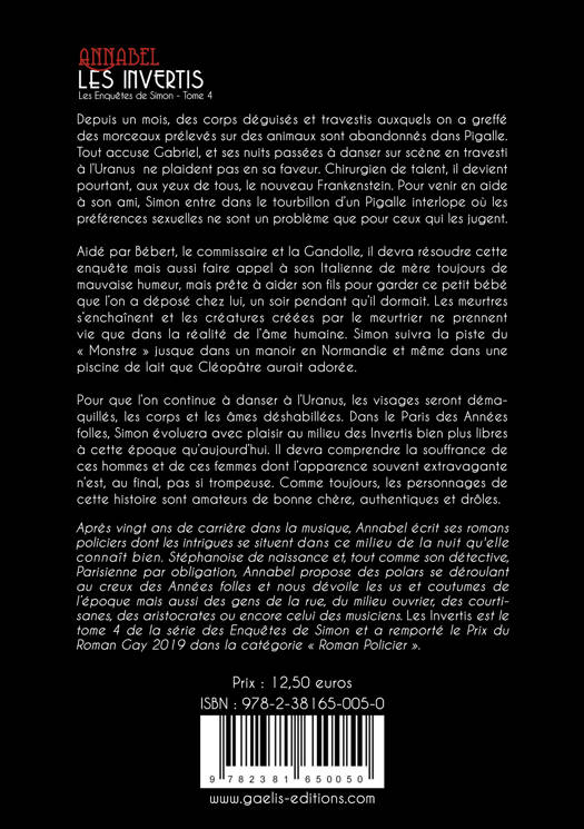 Depuis un mois, des corps déguisés et travestis auxquels on a greffé des morceaux prélevés sur des animaux sont abandonnés dans Pigalle. Tout accuse Gabriel, et ses nuits passées à danser sur scène en travesti à l’Uranus ne plaident pas en sa faveur. Chirurgien de talent, il devient pourtant, aux yeux de tous, le nouveau Frankenstein. Pour venir en aide à son ami, Simon entre dans le tourbillon d’un Pigalle interlope où les préférences sexuelles ne sont un problème que pour ceux qui les jugent. Aidé par Bébert, le commissaire et la Gandolle, il devra résoudre cette enquête mais aussi faire appel à son Italienne de mère toujours de mauvaise humeur, mais prête à aider son fils pour garder ce petit bébé que l’on a déposé chez lui, un soir pendant qu’il dormait. Les meurtres s’enchaînent et les créatures créées par le meurtrier ne prennent vie que dans la réalité de l’âme humaine. Simon suivra la piste du « Monstre » jusque dans un manoir en Normandie et même dans une piscine de lait que Cléopâtre aurait adorée. Pour que l’on continue à danser à l’Uranus, les visages seront démaquillés, les corps et les âmes déshabillées. Dans le Paris des Années folles, Simon évoluera avec plaisir au milieu des Invertis bien plus libres à cette époque qu’aujourd’hui. Il devra comprendre la souffrance de ces hommes et de ces femmes dont l’apparence souvent extravagante n’est, au final, pas si trompeuse. Comme toujours, les personnages de cette histoire sont amateurs de bonne chère, authentiques et drôles.